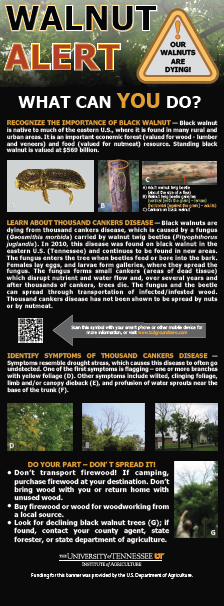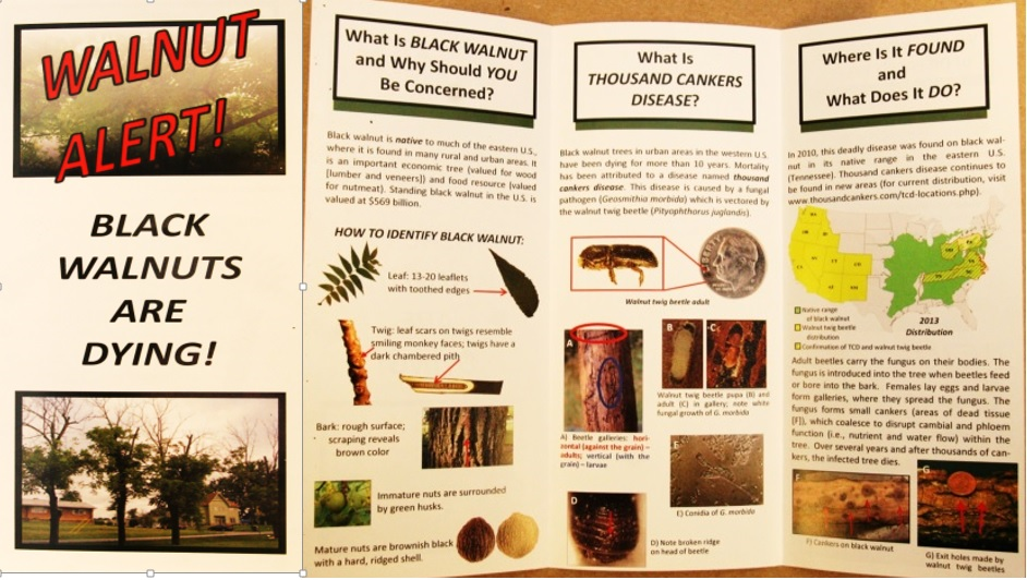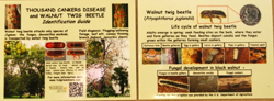 | A tri-fold pamphlet titled ‘Walnut Alert! Black Walnuts Are Dying’ is now available! You may request copies of this pamphlet or you may download the pdf document of the pamphlet and modify it to fit your local needs. Help spread the word and educate everyone about thousand cankers disease and its potential devastating impact to black walnuts in their native range. | ![]() |